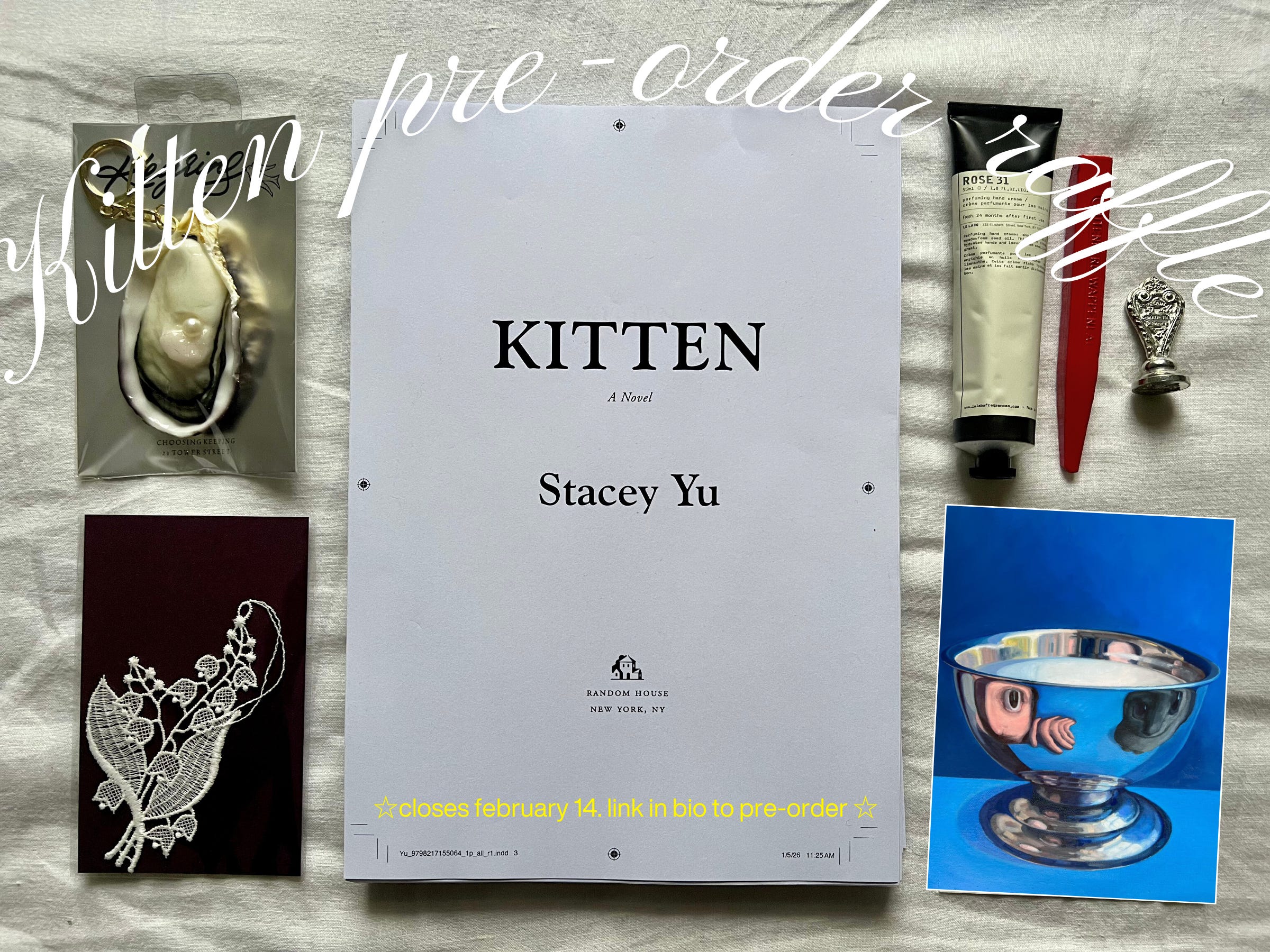 A reminder that I’m running a pre-order raffle for Kitten, where if you email me confirmation of your pre-order, you will be entered to potentially win an advanced copy of the book, an exclusive print of the pictured oil painting by Bean M, and a bunch of other goodies that have some connection to the world of Kitten but are mostly just nice to have and pretty to look at: Le Labo Rose hand cream, a cat stamp and red sealing wax, a hyperrealistic oyster key chain, and a starched lace ornament.