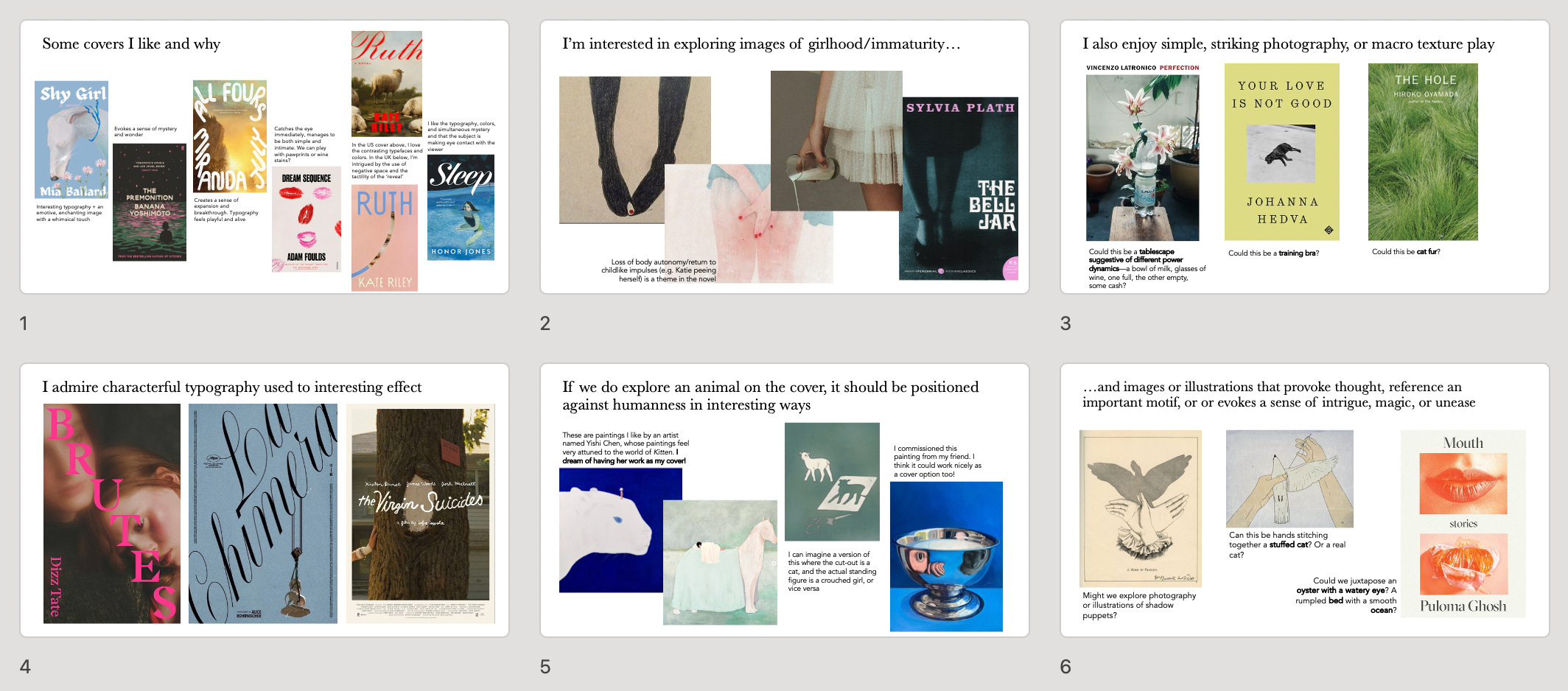 The process can be different for each book, but personally, I start each project by reading the manuscript and doing image research. The editors will give us a brief with thoughts about the target audience, the author’s notes, the settings or characters if necessary, and comp titles - books that are similar in tone and genre - which is probably the most important part! My personal favorite projects are when the editor will provide all of that information, and then say something like “but we trust your judgement, and feel free to bring any ideas to the table.” That’s what happened with Kitten, and obviously it proved very successful! :)